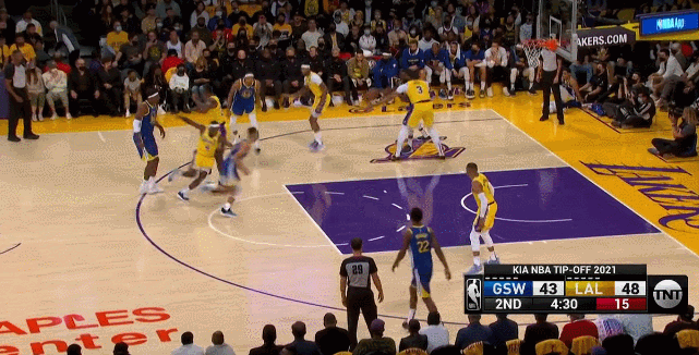 詹姆斯良好的外線手感和濃眉在內線翻江倒海的能力,讓湖人開局就掌握了場上的主動,尤其是維金斯和格林在第一節就都兩犯之後,湖人優勢十分明顯。