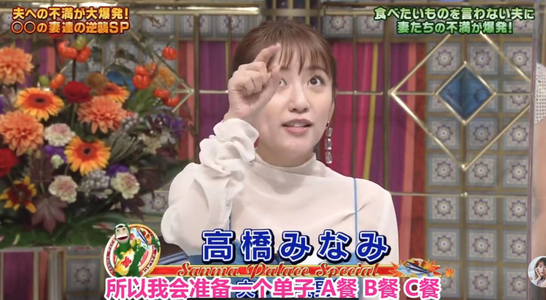 不刷牙、不洗澡,高橋南表示除此之外,她的老公還是一個非常難搞的人。每次問他想吃什麼,都不能給一個準確的回答。所以便為他準備了A、B、C三套食譜發給他讓他選擇。