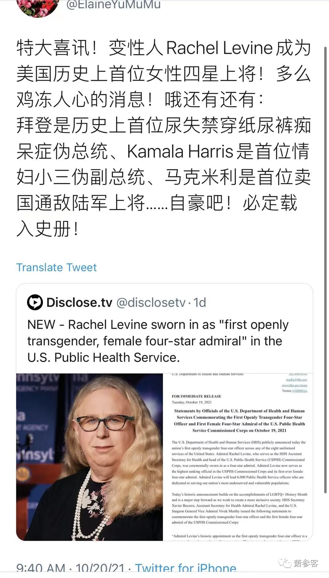 2021年10月19日,偽總統拜登任命假女人瑞秋·萊文(Rachel Levine)為首位“女性”四星上將了!
