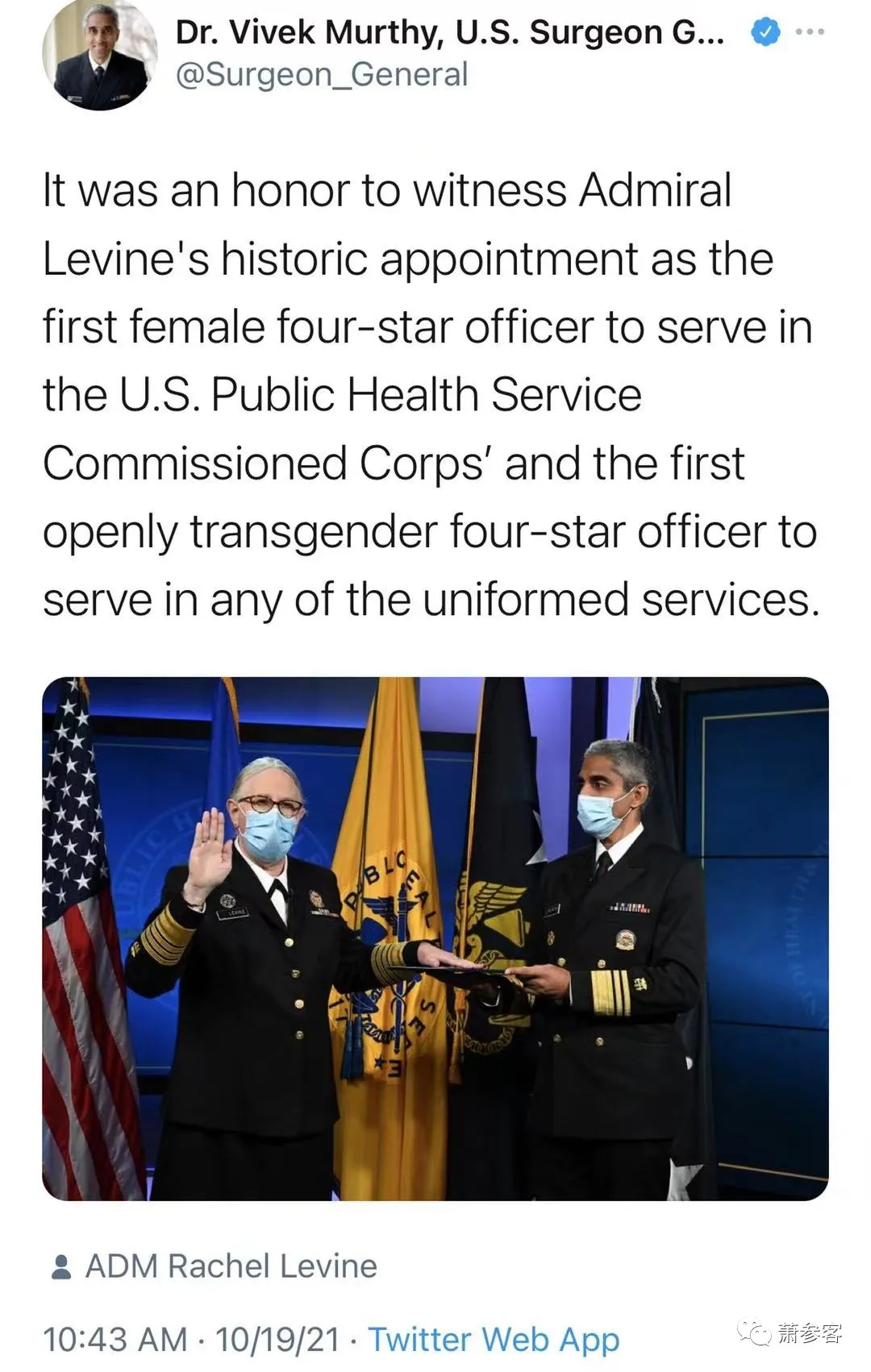 這是美國 “總醫官” (U.S. Surgeon General)説的:“她的(原文如此)服務無疑會促進美國公共衞生服務委員會(@usphscc,U.S. Public Health Service Commissioned Corps)的使命,保護、促進和推進我們國家的健康和安全。”