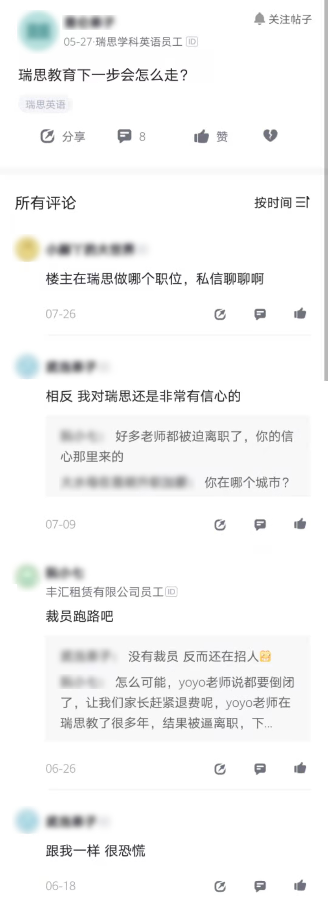 除了多位尋求仲裁的被裁員員工,記者注意到,脈脈上瑞思還在職的員工,對於公司未來發展也抱有疑慮。有備註為瑞思學科英語員工的網友發帖詢問“瑞思教育下一步會怎麼走”,下面評論區的網友看法不一,但也有人表示“很恐慌”。
