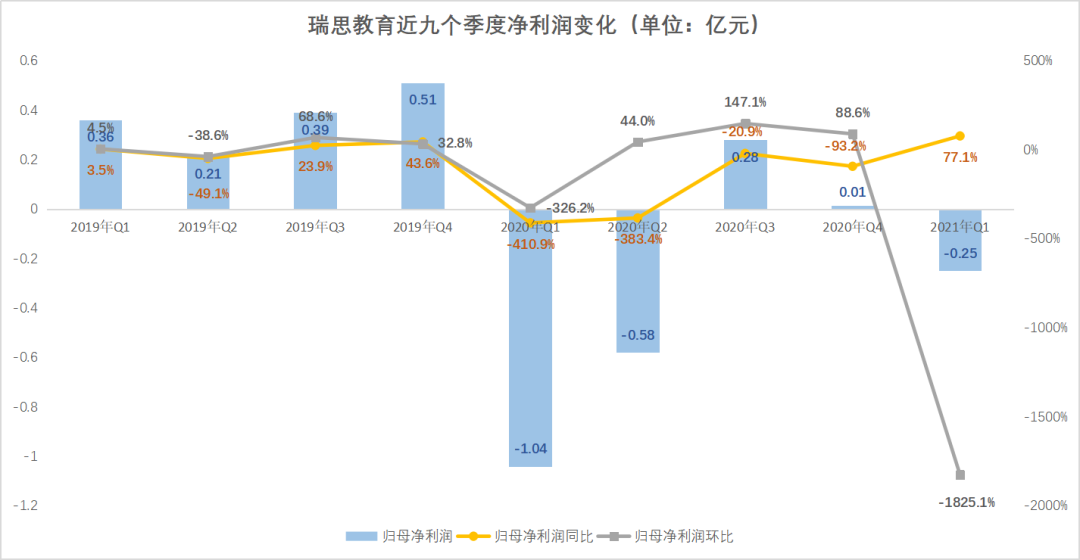 回顧第一季度業績,2021年第一季度,瑞思教育營收2.62億元,比上年同期的1.09億元,同比增長140%。而對比2020年第四季度實現的3.65億元營收,環比下降28.1%。如若與2019年一季度實現的3.35億元營收相比,減少了21.79%;甚至比2018年同期實現的2.70億元,減少了3.33%。