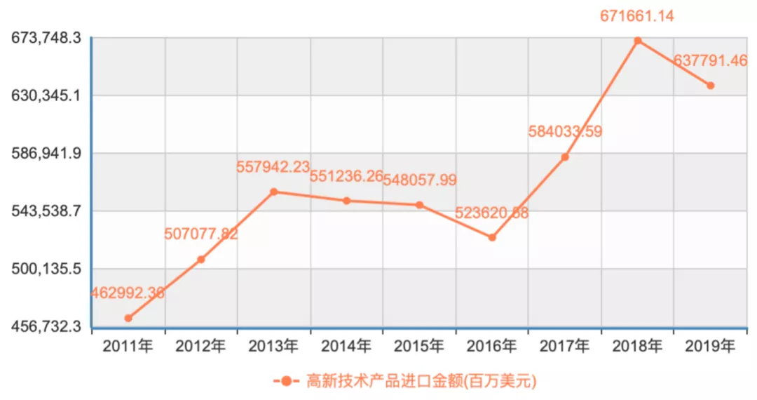 以下是近九年中國高新技術產品進口金額,一直處於高位,而且呈現逐年遞增的趨勢。2018年達到頂峯,為6716.61億美元。