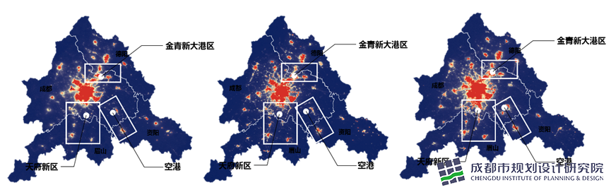 根據成都市規劃設計研究院研究表明,對比2012年、2015年、2019年三個時間維度的成德眉資燈光圖模型可以看到,成都周邊三個方向上的亮度有了明顯提升,熱力範圍也在逐步擴大,形成了一定的“都市連綿區”。