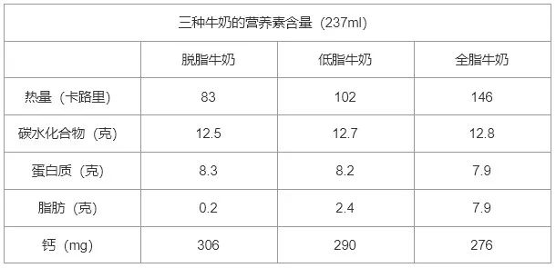 脱脂牛奶指脂肪含量在0.5%以下的牛奶,低脂牛奶脂肪含量在1%-2%之間,而全脂牛奶一般在3%以上。有時候買來的脱脂牛奶營養成分表中會沒有鈣,這是因為鈣不是必須要標出的成分。從下面三種牛奶營養素含量的比較中我們可以發現,同樣237ml的脱脂牛奶鈣含量反而會略高於全脂牛奶。