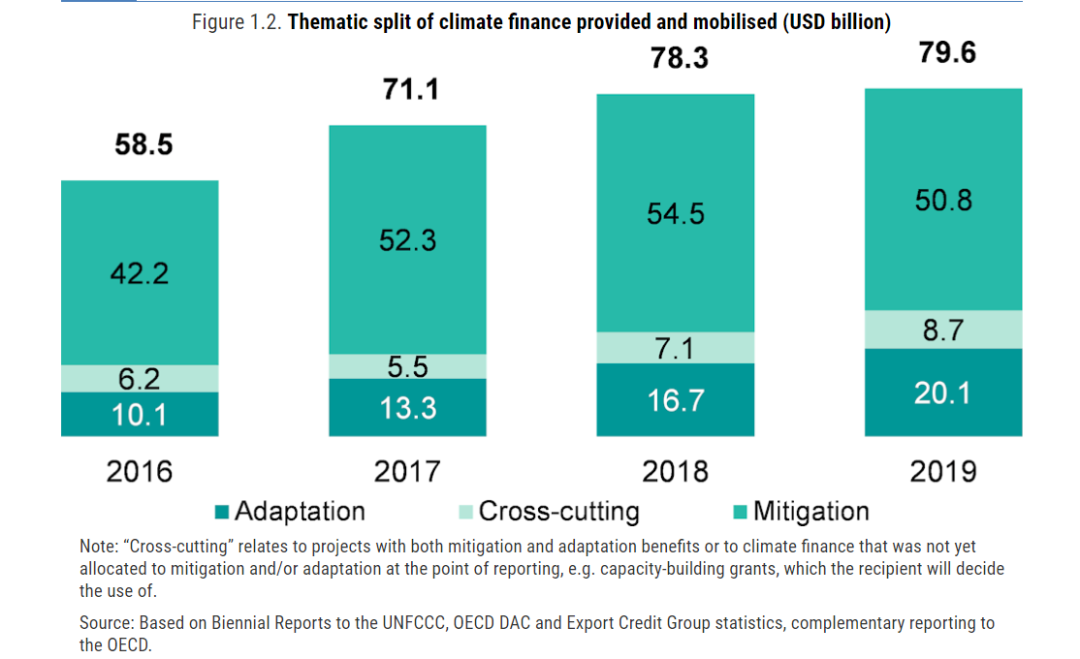 此外,發展中國家認為,氣候資金應當考慮到發展中國家的實際需求,切實回應發展中國家所面臨的由氣候變化所導致的急迫問題,要求氣候資金需要在適應和減緩之間取得平衡。同樣根據OECD數據,2019年的796億美元中,用於減緩的資金規模是用於適應的資金規模的2.5倍,較2018年的3.2倍有所緩解,但仍顯示出當前氣候資金“重減緩、輕適應”的特點。
