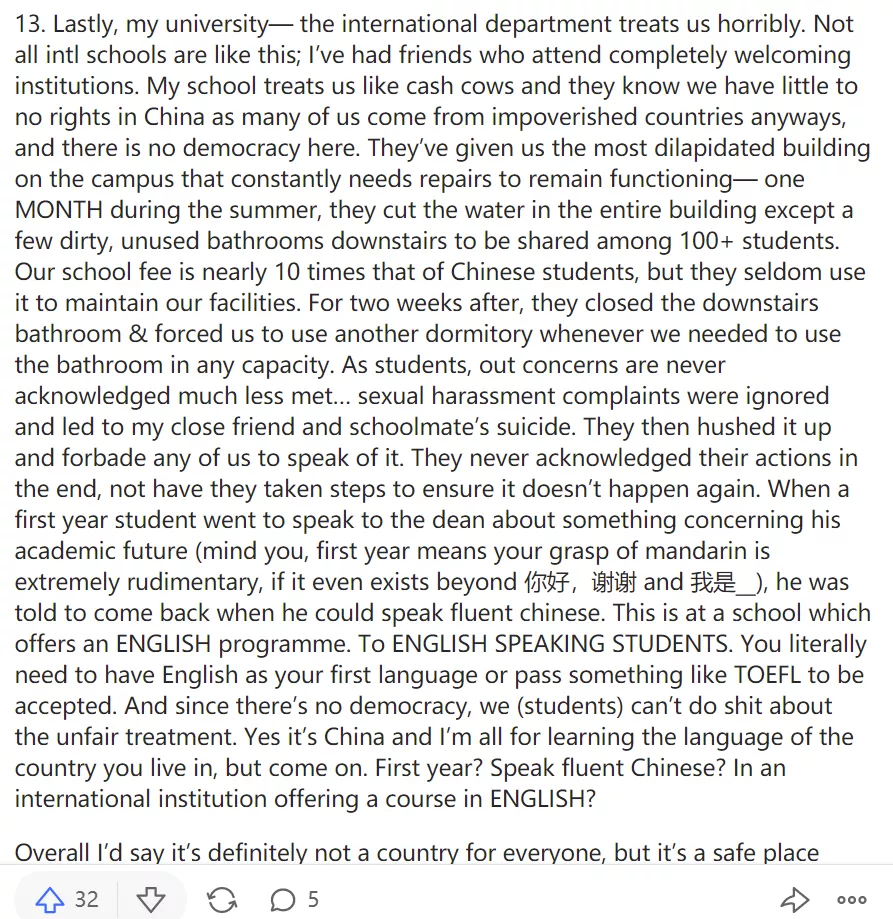 13. 最後,我的大學--國際部對待我們很糟糕。不是所有的國際學校都是這樣的,我有一些朋友在完全友好的機構上學。我的學校把我們當作搖錢樹,他們知道我們在中國幾乎沒有任何權利,因為我們中的許多人來自貧窮的國家,而且學校沒有民主。他們給我們提供了校園裏最破舊的建築,不斷需要維修以保持功能--在夏天的一個月裏,他們切斷了整個建築的水,只有樓下幾個骯髒的、未使用的浴室供100多名學生使用。