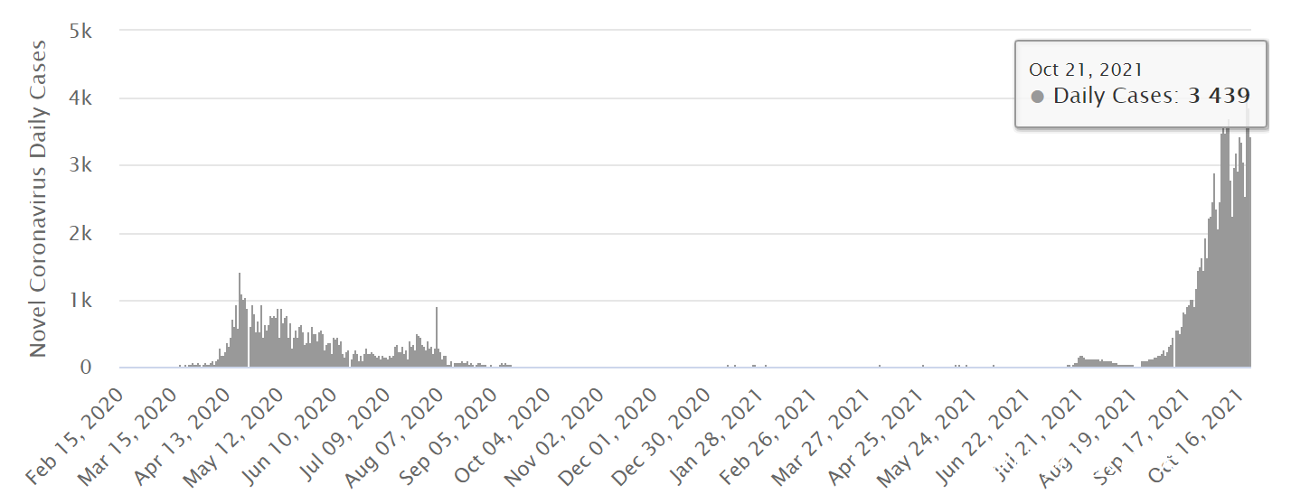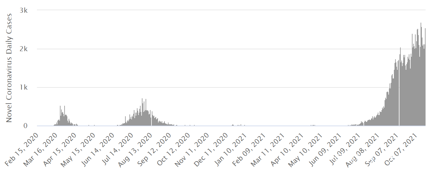 新加坡單日新增確診病例(2020.02.15-2021.10.21**)**