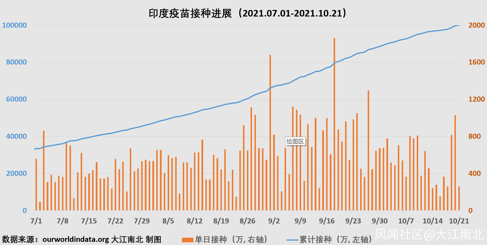 截止2021年10月21日,印度累計接種10.0****億劑,列第二位,**其中單日新增接種260萬劑。**印度每百人累計接種71.77劑,是中國的45.2%。