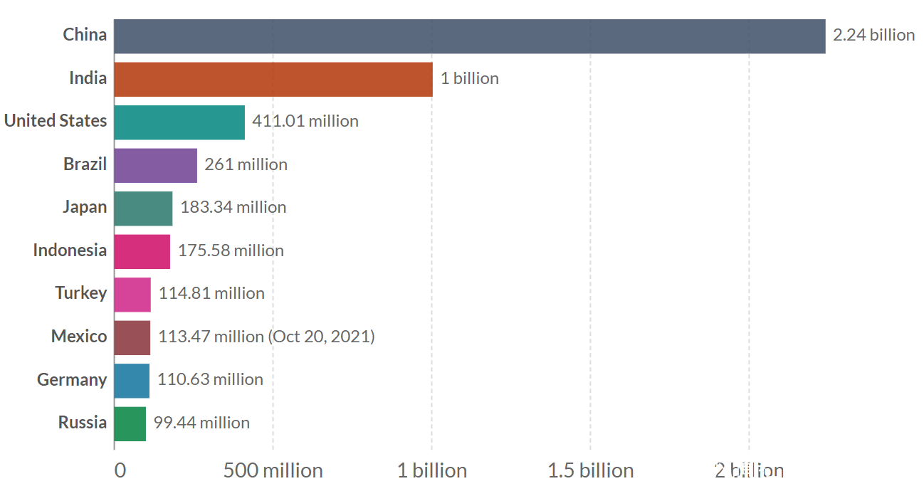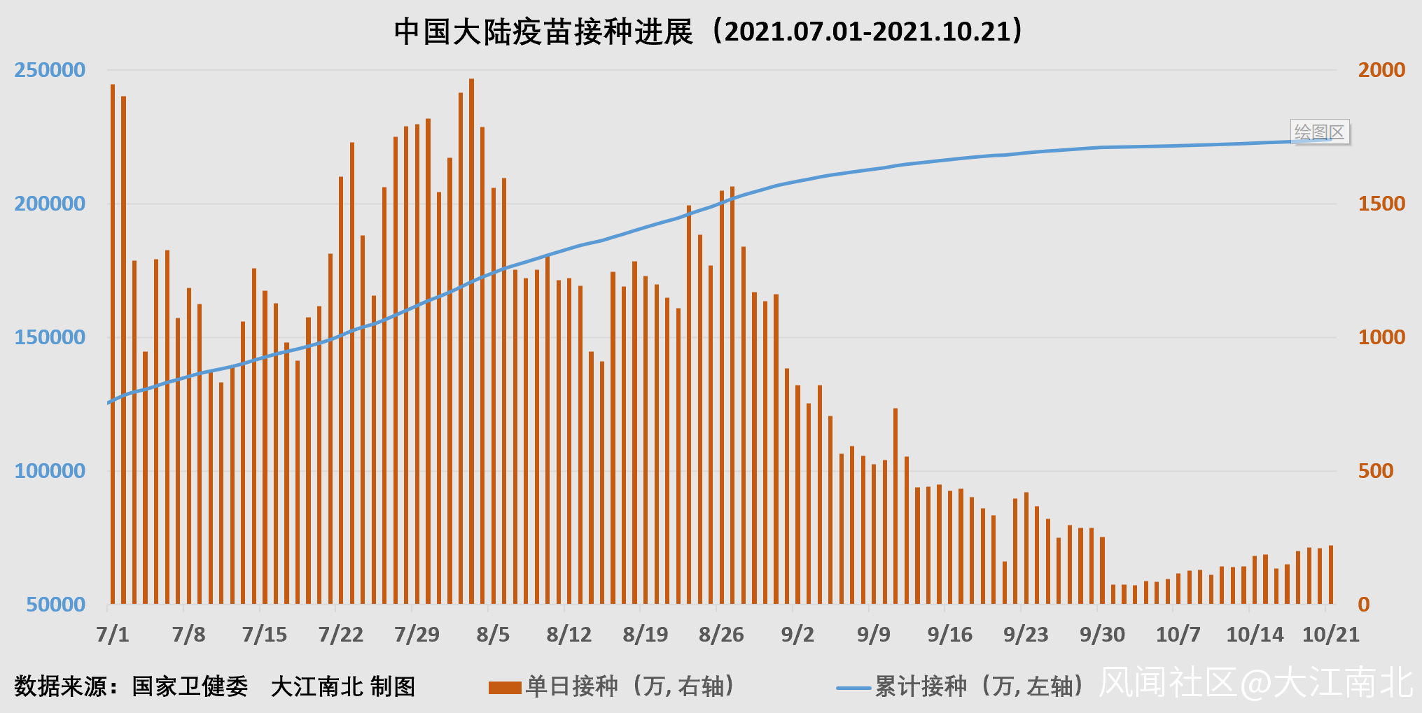 截止2021年10月21日,中國大陸累計接種新冠疫苗22.4055億劑,繼續位居全球第一位,佔全球累計接種劑數的33.0%;其中單日新增接種223萬劑,佔全球單日接種劑數的9.9%。隨着各地加強針接種工作的啓動,國內接種劑數有所反彈。中國每百人累計接種158.70劑,環比增加0.15劑,是美國的1.30倍,位居世界主要大國之首。