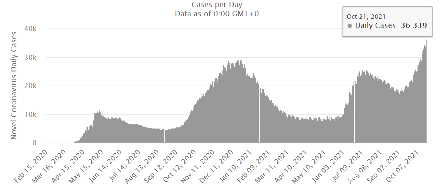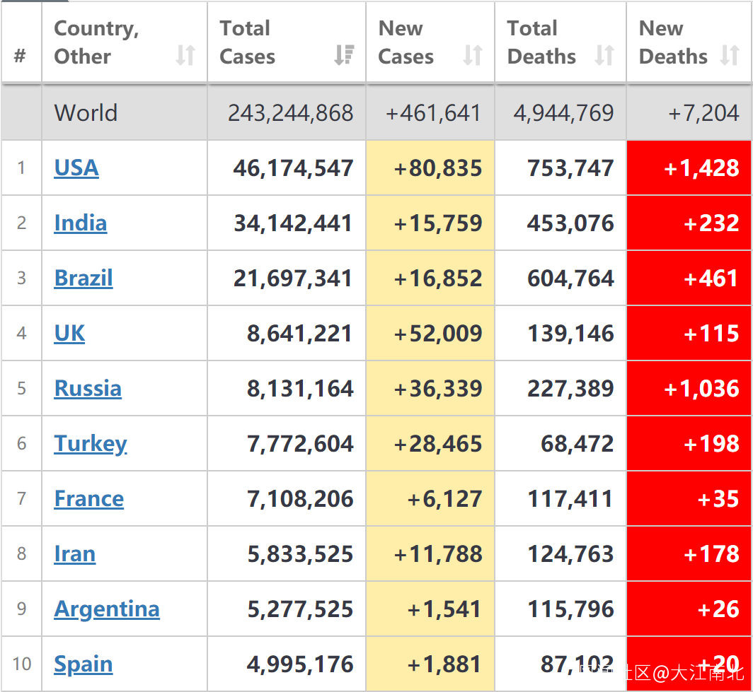 10月21日,全球新增新冠確診461,641例;累計確診2.4324億例;新增病亡7,204例;累計病亡494.48萬例。全球這一波疫情呈探底拐頭上翹趨勢。