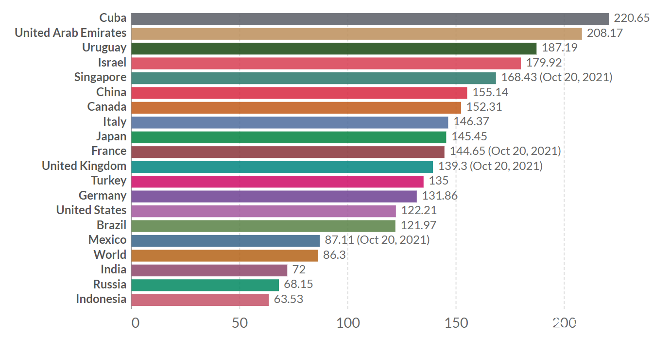 世界主要大國**+**部分小國每百人接種劑次(2021.10.21)