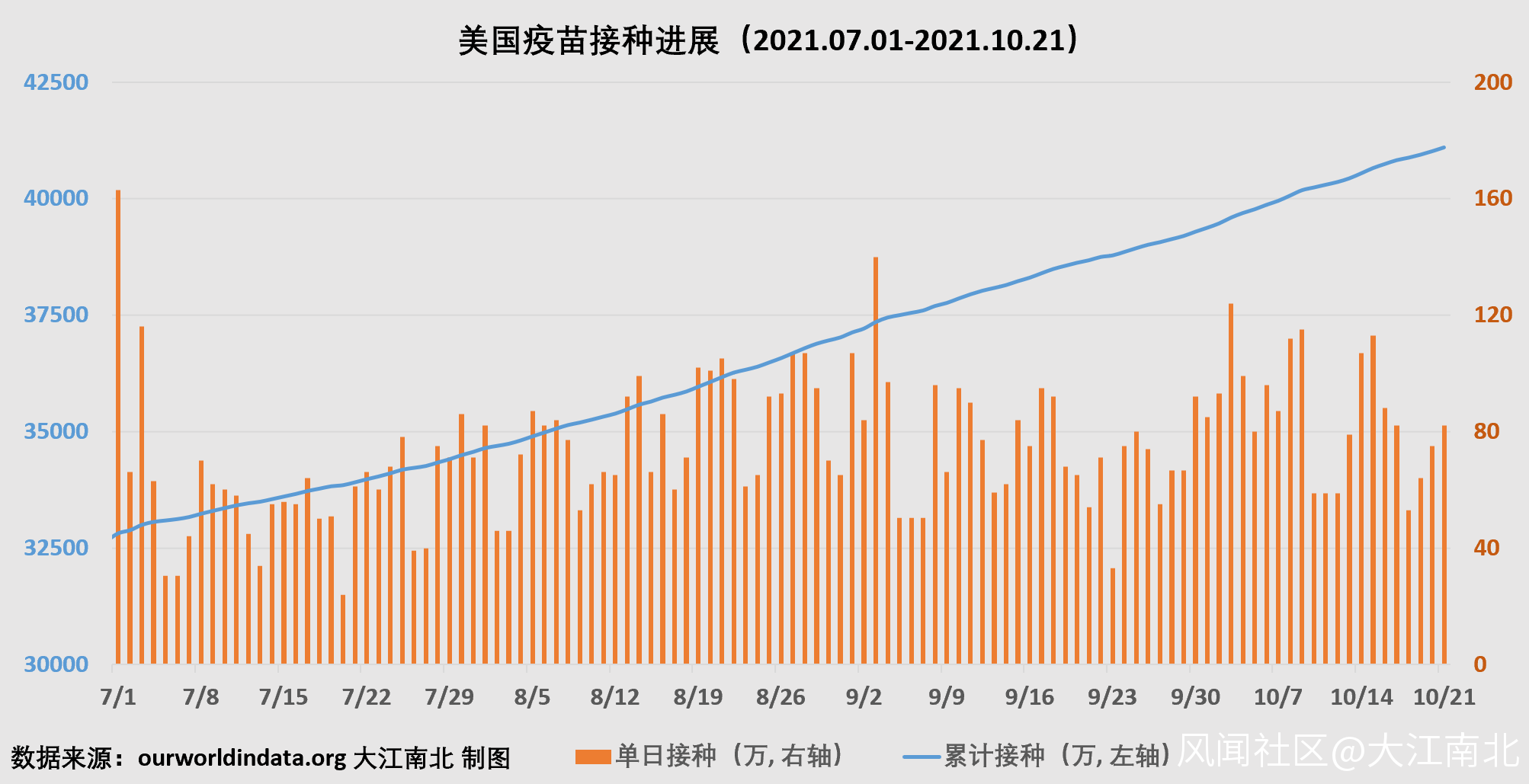 截止2021年10月21日,美國累計接種4.1101億劑,居全球第三位;其中單日新增接種82萬劑。美國每百人累計接種122.20劑,比中國低36.50劑,是中國的77.0%。