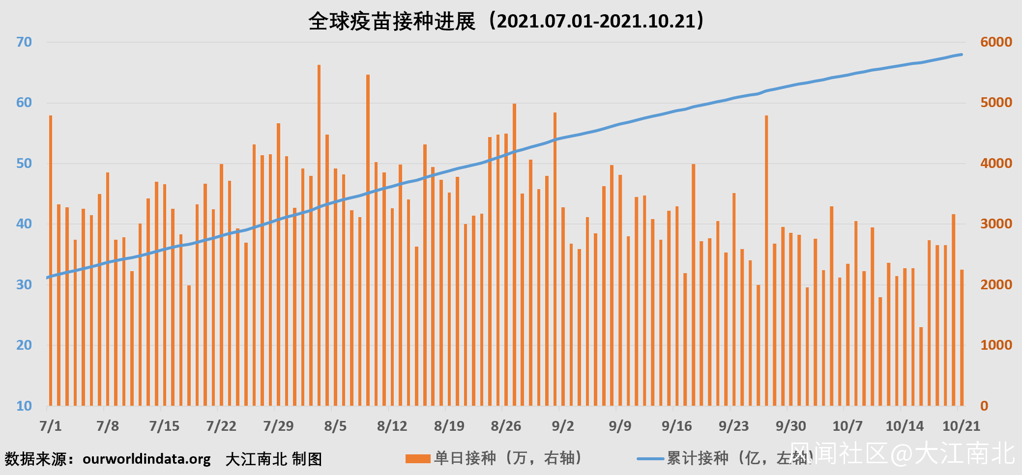 截止2021年10月21日,全球累計接種新冠疫苗67.96億劑;**其中單日接種2251萬劑;**平均每百人接種86.30劑,環比增加0.29劑。