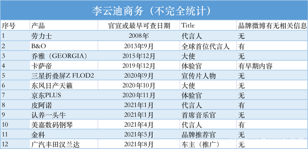 同時,據北京商報報道,近年來逐漸走上綜藝道路的李雲迪,曾經或正在合作的品牌包括京東、東風日產、勞力士、三星摺疊屏、卡薩帝、皮阿諾、美嘉電鋼琴、仰大公學、巴黎歐萊雅、海洋絲緞、TOM FORD等。“哥哥”效應加持他還在8月成為了廣汽豐田漢蘭達的品牌代言人。目前這些品牌多已澄清了合作關係。