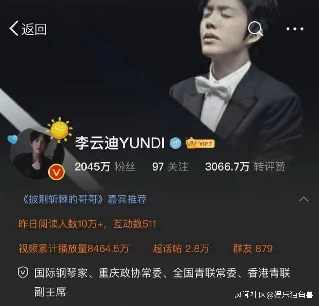 隨後,中國音樂家協會宣佈取消其會員資格,中演協表示對其進行從業抵制,四川音樂學院摘除李雲迪鋼琴工作室牌匾,上週五剛剛上線的廣州文旅宣傳片也緊急下架……一夜間,李雲迪的微博頭銜去除了 “重慶政協常委、全國青聯常委、香港青聯副主席”等多重身份,徒留 “國際鋼琴家”。