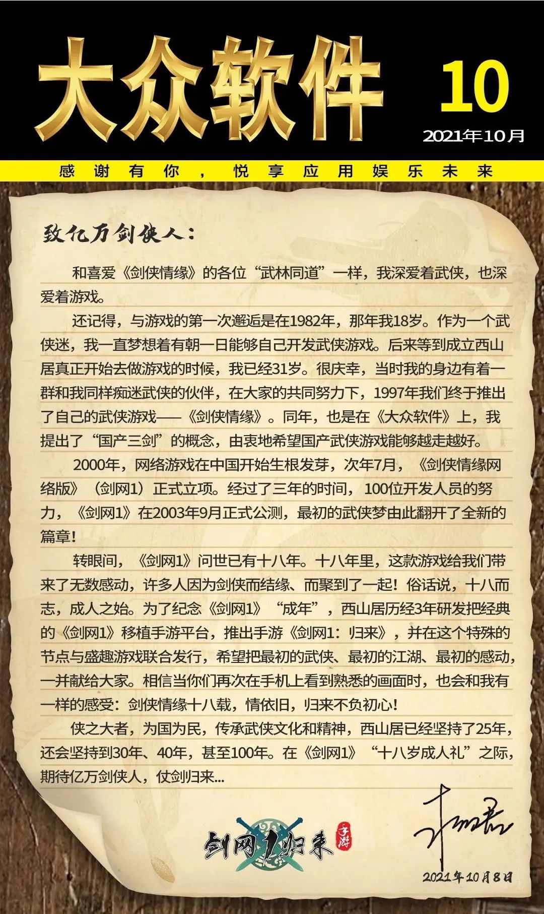 《劍網1:歸來》上線前,求伯君專門寫了封《致億萬劍俠人》,表示“劍俠情緣18載情依舊”,期待玩家們“仗劍歸來”。