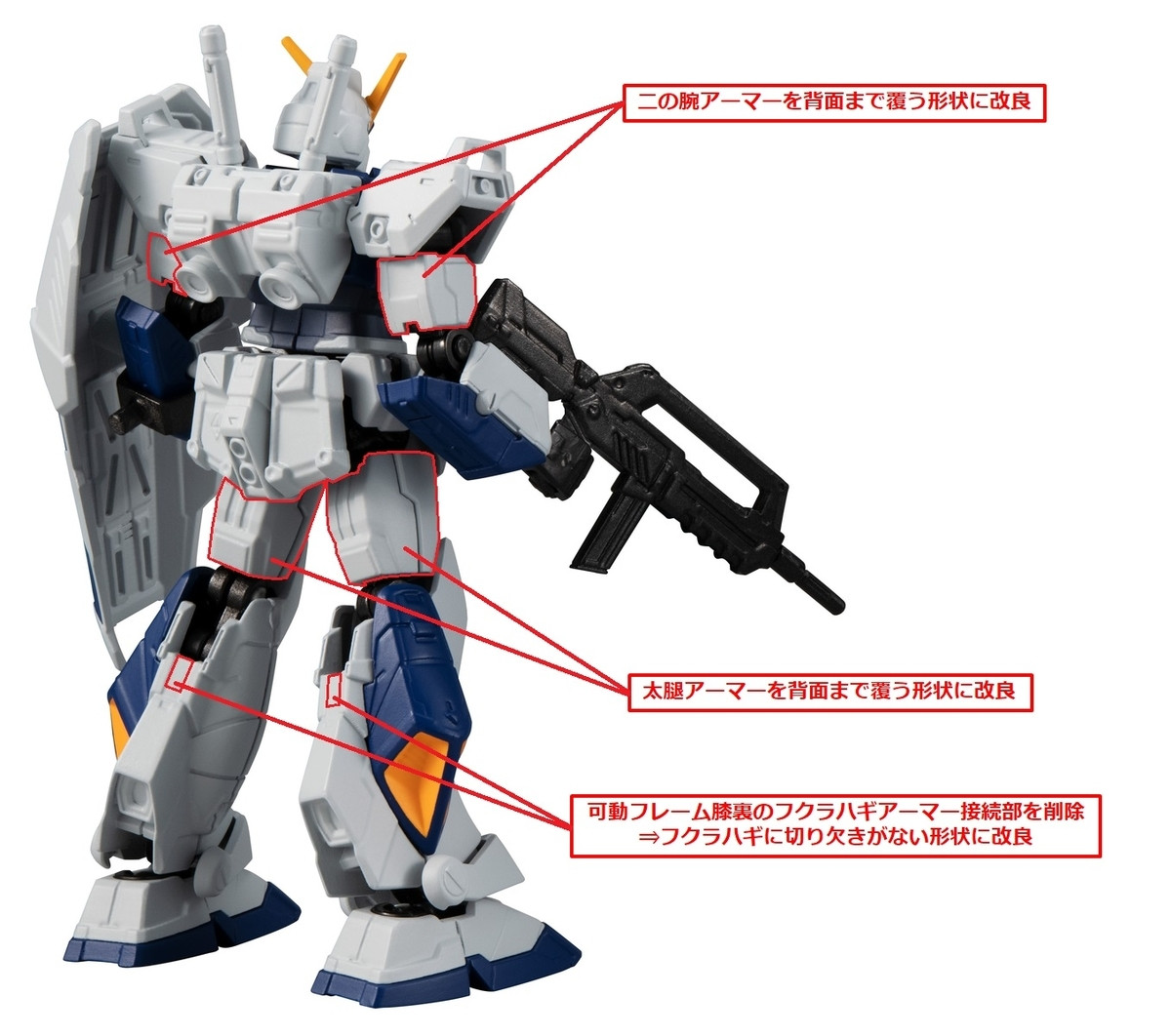 除了保留了原本骨架+裝甲的“1+1”核心玩法以外,還對雙腕、大腿、小腿部位進行改良,外裝變更為FULL ARMOR樣式,可動骨架“骨架[01]”(即是聯邦系計提的可動骨架)的內膝部中的小腿裝甲接續部被廢除,從而讓機體的背面更加接近設定!
