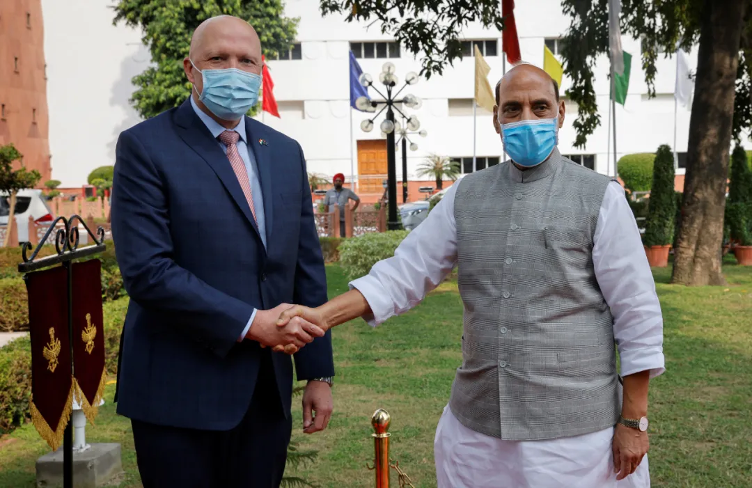2021年9月11日,印澳召開了首次外交部長與國防部長的“2+2”對話。圖為9月10日澳防長彼得·達頓訪印並會見印防長拉傑納特·辛格。圖源:“世界知識”微信公眾號