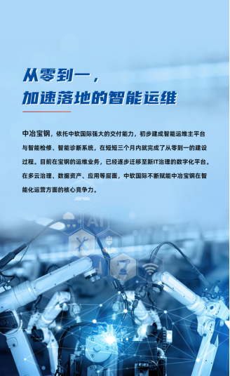 王建軍表示中冶寶鋼通過與中軟國際深入合作,在短短三個月內就將數字化基座、智能運維運營平台以及生態運營&服務能力有機整合,初步建成智能運維主平台與智能檢修、智能診斷系統。目前在寶鋼的運維業務,已經逐步遷移至這套數字化平台。