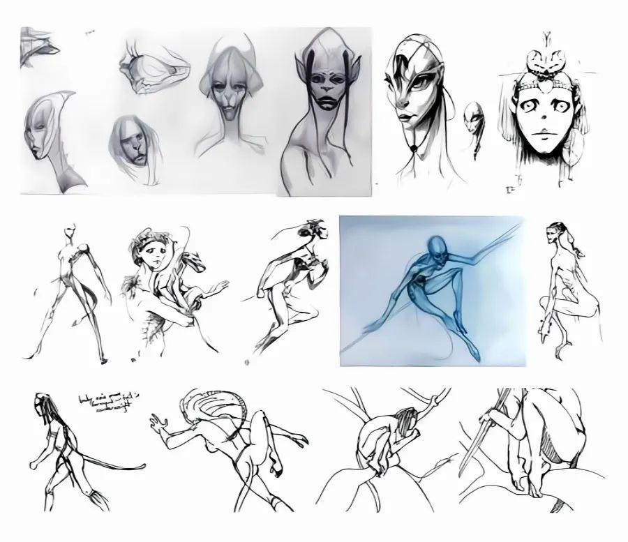 卡梅隆親筆繪製的納美公主Neytiri手稿,參考了貓和獵豹等貓科動物的樣貌特徵,畫面中的女主角跟電影成片後的樣子相似度達66.6%。