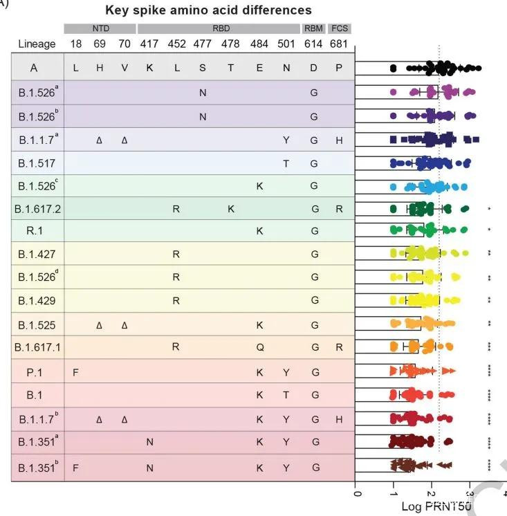 研究人員也對各種變異病毒的免疫逃逸情況進行了綜合分析,其中刺突蛋白具有E484K和N501Y/T突變的變異株是造成中和能力下降最顯著的,意味着這些關鍵位點的突變對減弱疫苗的保護非常關鍵。這類變異新冠病毒包括最早在南非發現的Beta變種(B.1.351)和最早在巴西發現的Gamma變種(P.1)。