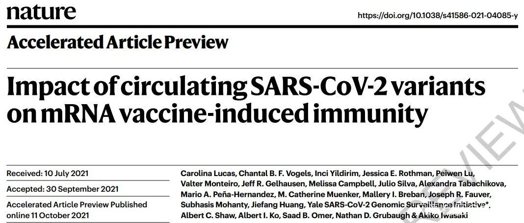 [1] Carolina Lucas et al., (2021) Impact of circulating SARS-CoV-2 variants on mRNA vaccine-induced immunity. Nature Doi: https://doi.org/10.1038/s41586-021-04085-y