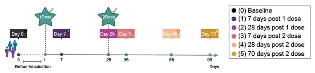 研究人員從參與者接種疫苗前到接種第二劑後70天定期採集了血液樣本進行評估