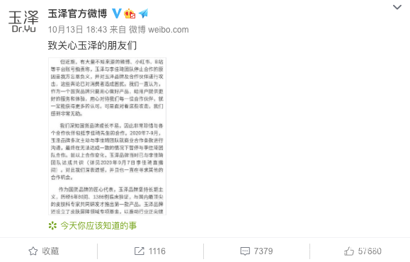 這些導火索讓玉澤發了一則聲明,大概內容解釋瞭解綁是雙方團隊協商後達成的共識,也強調了自己是國貨品牌代表,懇請網友停止“以訛傳訛”。