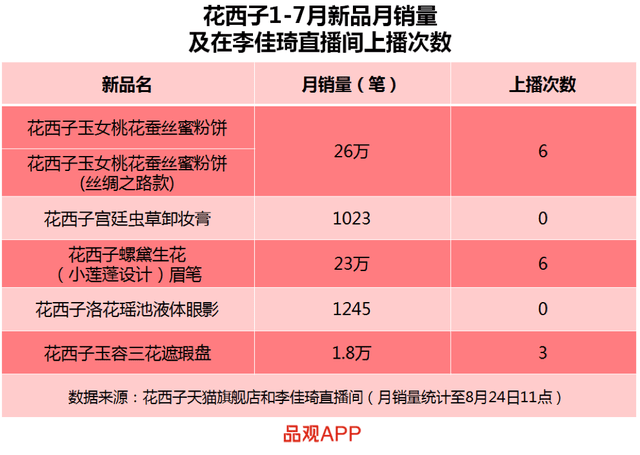 同樣是李佳琦帶火的國貨品牌花西子,也嚐到了主播帶來的流量紅利,一度讓業界認為花西子淪為為李佳琦“打工”。品觀app去年的一組數據可以看到,李佳琦上播次數對產品銷量的對比十分顯著。