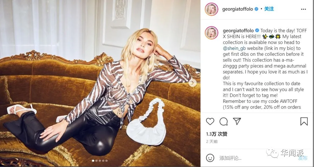 真人秀《切爾西製造》女星佐治亞·託佛洛(Georgia Toffolo)是英國當紅的時尚潮人。兩天前,她在Instagram上發佈了一張照片,為她與時尚品牌SHEIN合作的新一季服裝系列打call。她身上這件衣服的售價只有8.49鎊。