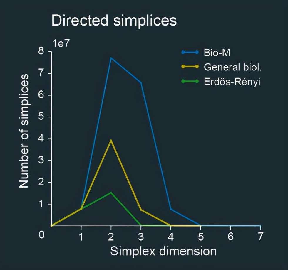 他們構造了一種隨機網絡(圖中的綠線),從任何一組數量相近的結點開始,隨機地往外連線,使網絡中邊的數量保持一定,連接每個節點的邊數也保持一定,這與神經微電路相似。在這種網絡中,有向單純形的數量非常少,而且沒有維數在4以上的單純形。他們發現,在更為一般的生物網絡中(不考慮神經元的形狀大小),也存在這種現象。