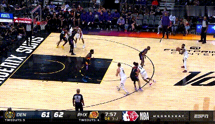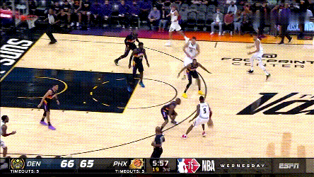 **掘金做得更好的,還有進攻的多樣性。**沒有穆雷,掘金的進攻發起會更集中於約基奇,太陽有肉盾,艾頓在季後賽很好的抵擋了約基奇的衝臉,又趕上約基奇處於跳投狀態的低谷,使得掘金沒能追求到一輪互爆局。在低位不好錘的時候,高位策應,靠前鋒的體型優勢直接打穿籃下是另一種辦法,掘金這場比賽也做了這樣的嘗試,但約基奇越是想找隊友的空切,反倒因為太過刻意不好得手。