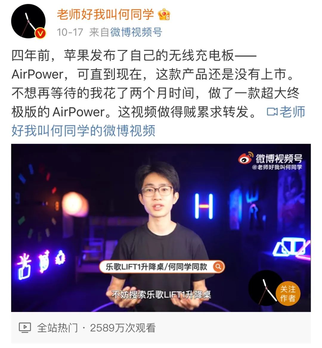 在“消失”三個月後,他復更了一條《我做了蘋果放棄的產品…》,並在視頻的最後一分鐘,很happy地接入了樂歌產品的廣告。