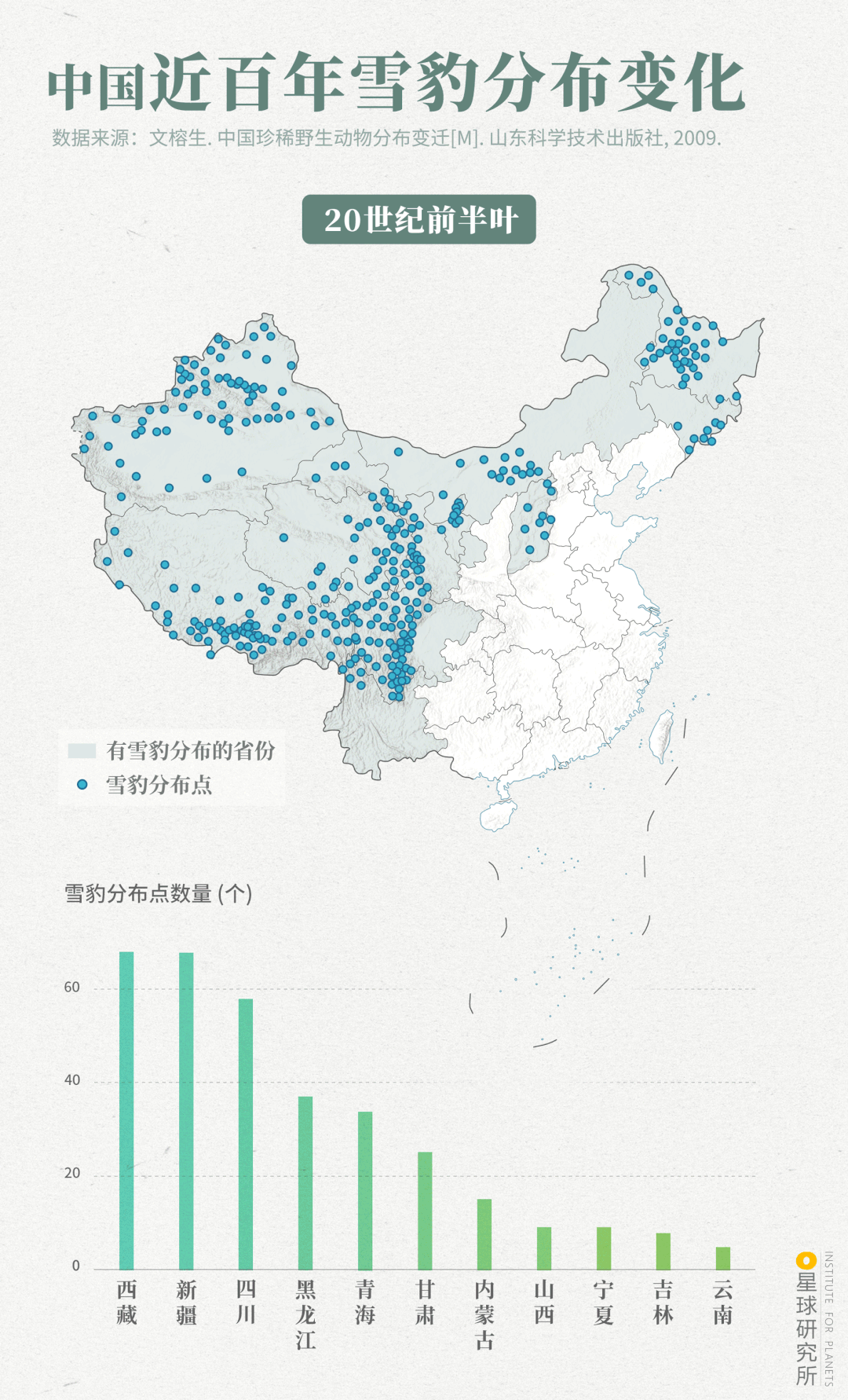 (近百年來我國雪豹分佈區變化示意圖。需要注意的是,如今許多專家認為東北地區的雪豹記錄很可能是對遠東豹的一種誤判,並不準確,所以該圖呈現的結果請謹慎參考,製圖@鄭藝/星球研究所)