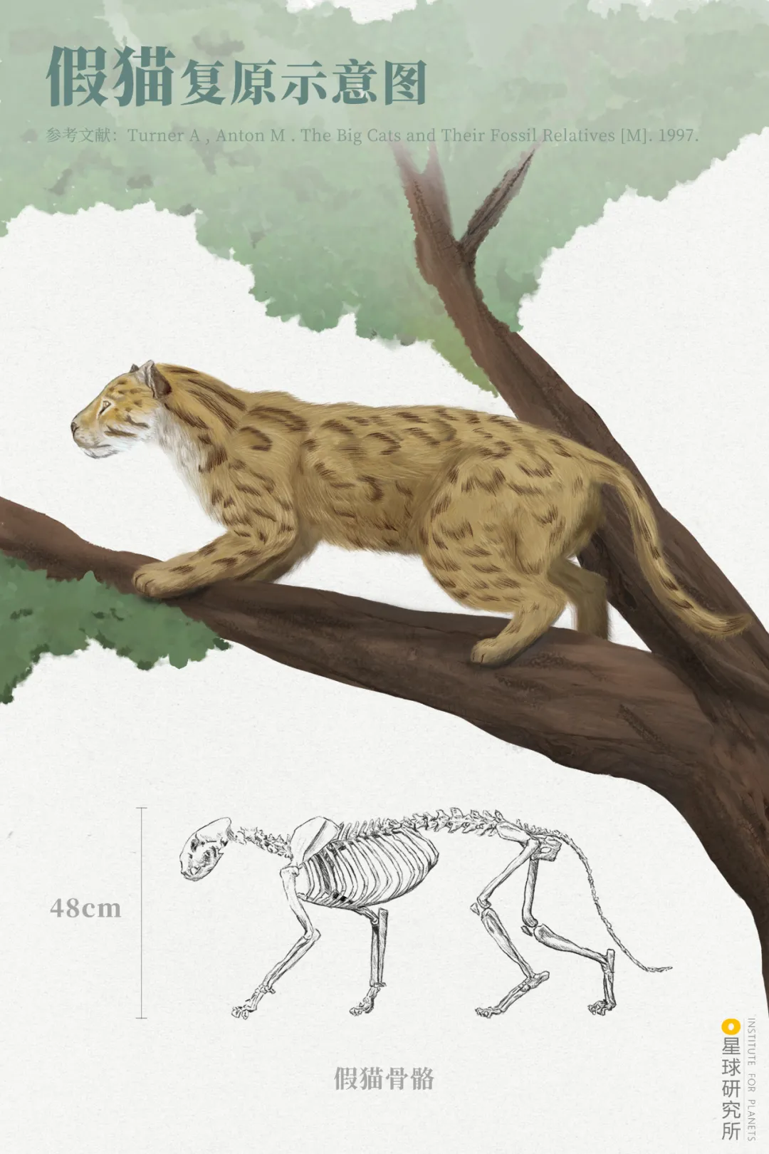 (假貓屬物種生活於2000至800萬年前之間的歐亞以及美洲大陸,根據化石記錄,學界普遍認為它們是現生所有貓科(Felidae)動物的祖先,相比於現代的貓科動物,假貓具有“身長腳短”的形態特徵,製圖@楊寧/星球研究所)