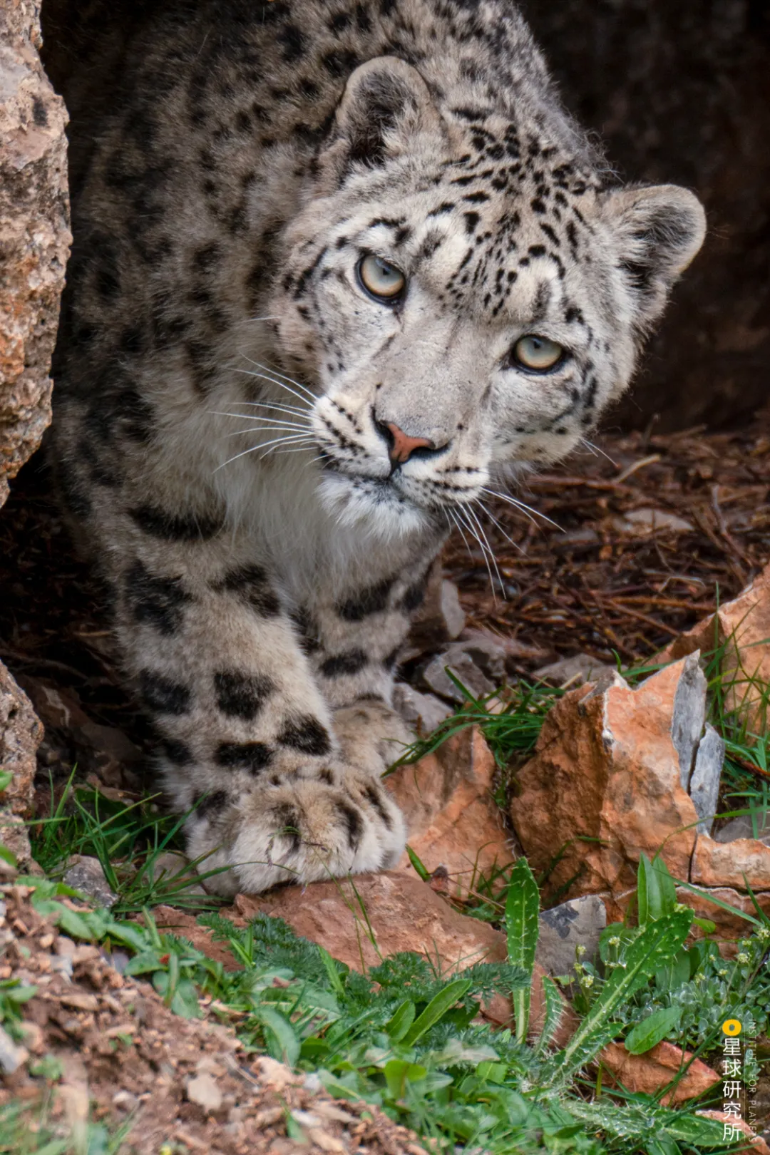 (在不同的統計中雪豹的數量並不一致,此處依據的是IUCN最近的評估結果,也有學者認為雪豹的數量更多;一頭正在哺育期的雌性雪豹從巖穴中探出腦袋,青海昂賽,攝影師@奚志農/野性中國)