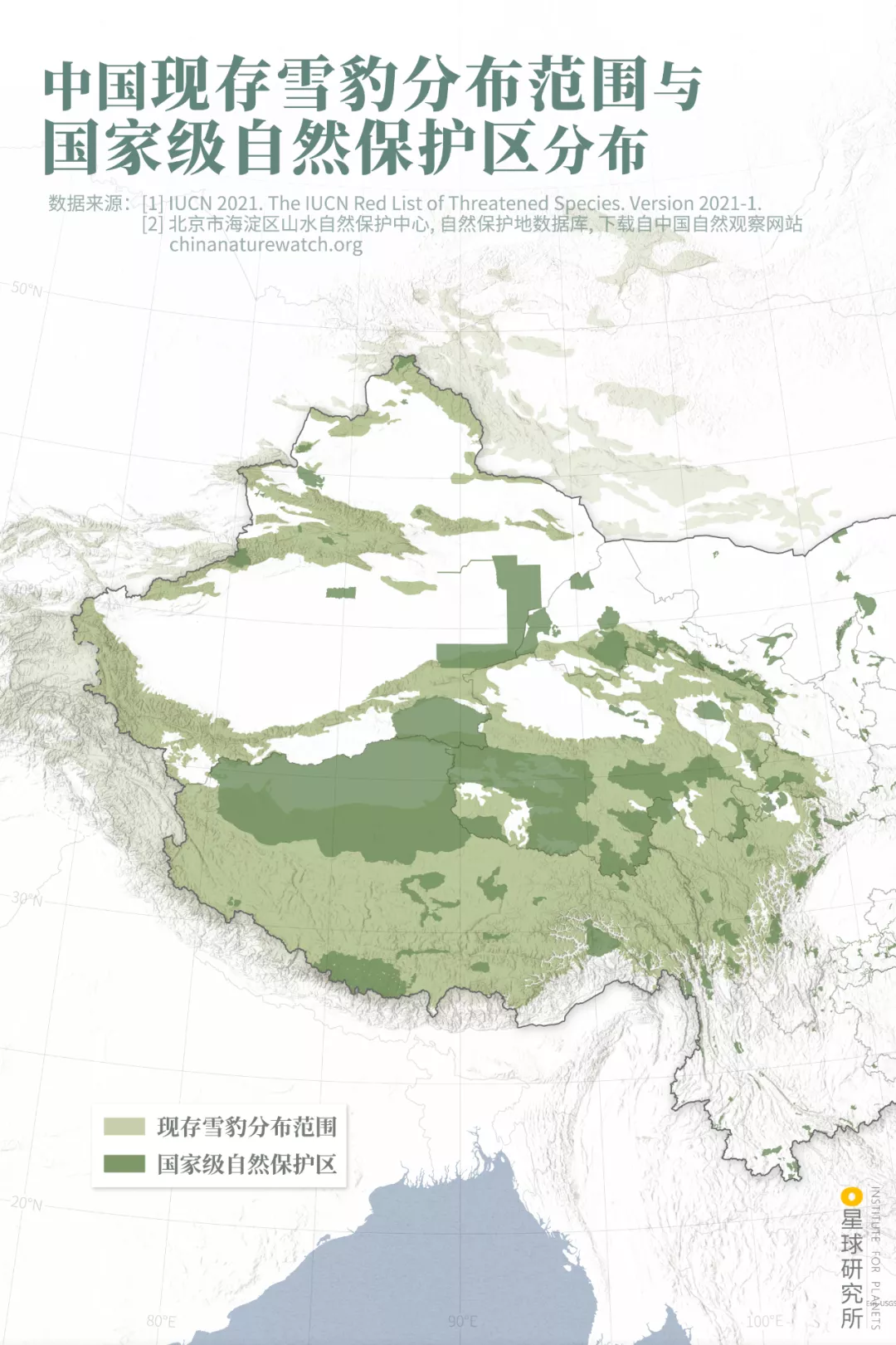 (目前中國雪豹分佈區和國家級自然保護區的分佈示意圖,製圖@鄭藝/星球研究所)