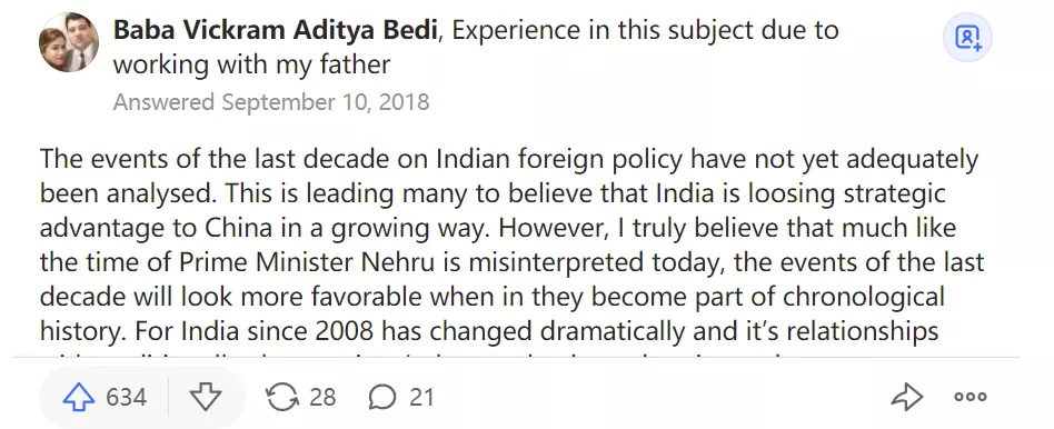 印度網民 Baba Vickram Aditya Bedi 的回答則顯得非常自大,並且錯誤解讀了中國外交政策和對外投資的決心,但是這個話題的讀者基本是印度人,因此這種"自信"回答獲得了600+贊。