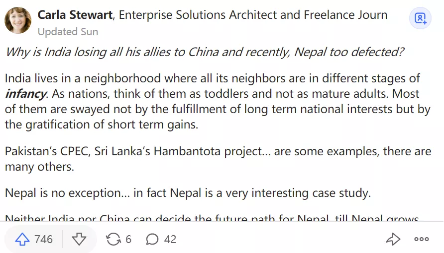 很顯然,這個話題吸引了大量印度網民的回答,一些西方網民更是煽風點火,例如美國網民 Carla Stewart 就發表了污衊中國是糖爹、煽動印度網民的言論,獲得700+高贊也就可以理解了。