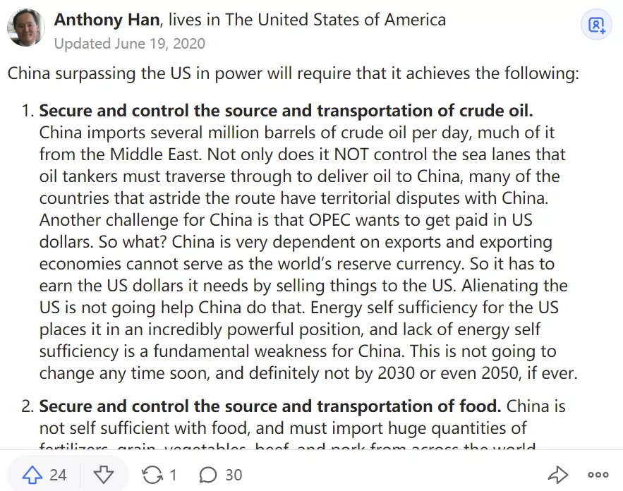 中國的糧食不能自給自足(小編注:中國幾十年前就已經實現了糧食自給自足),必須從世界各地進口大量的化肥、糧食、蔬菜、牛肉和豬肉。大多數出口糧食的國家也希望以美元獲得報酬。嗯,和上面的問題一樣。更糟糕的是,許多糧食出口國與中國隔着世界上的大洋,這對中國來説將是非常具有挑戰性的,尤其是在疏遠美國之後,要把糧食安全地運回中國。同樣,這些都是美國的天然優勢,也是中國的天然劣勢,永遠不會改變。那麼,中國連自己都養活不了,怎麼可能比美國更強大?