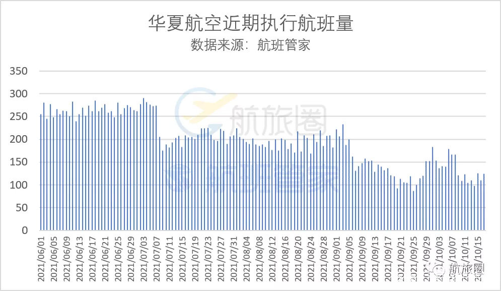 航班管家數據顯示,10月11日至17日,華夏航空日均航班量僅為113班,較2019年同期減少65%,日均旅客運輸量約1萬人次,較2019年同期減少62%。
