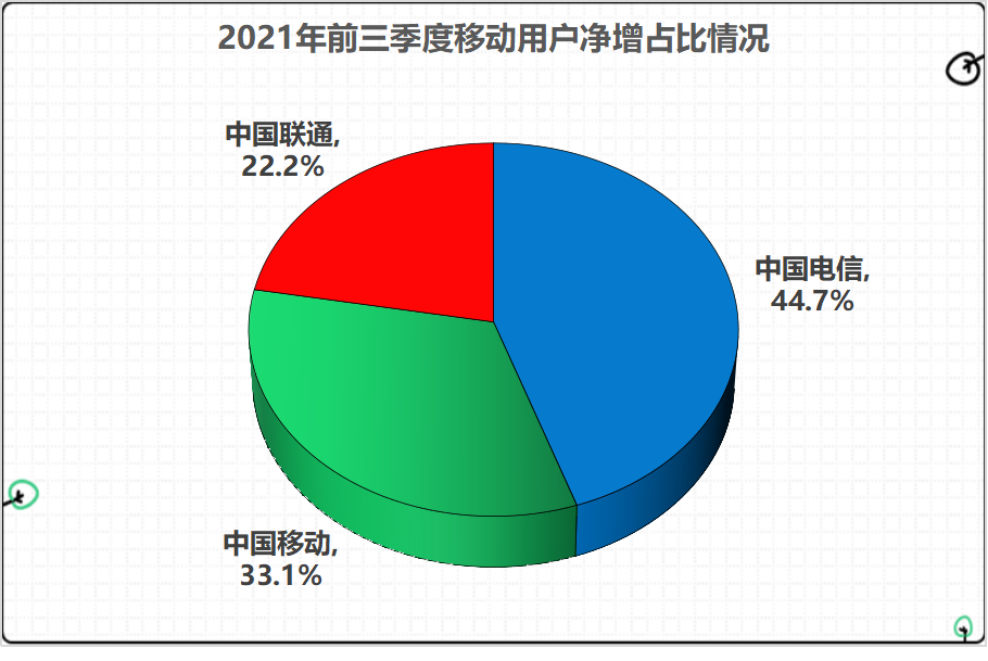 2021年前三季度,中國電信淨增移動用户1864萬户,同期,中國移動淨增1378.8萬户,中國聯通淨增924.2萬户。計算下來,在2021年前三季度移動用户淨增市場,中國電信佔據44.7%,中國移動為33.1%,中國聯通為22.2%。