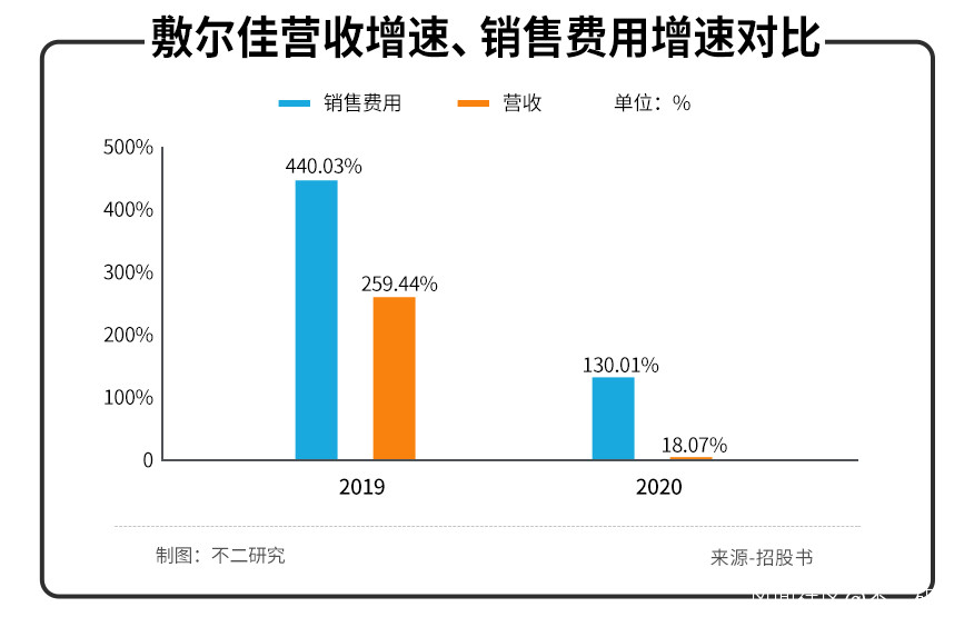 此外,「不二研究」發現,敷爾佳的銷售費用增速,遠超同期營收增速。2019-2020年,銷售費用增速為440.03%和130.01%,營收增速則為259.44%和18.07%。