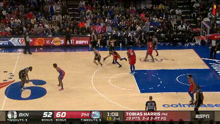 順帶説一下,哈里斯為何總是腦殘般的內切送冒,不老老實實外切。其實他今天外拆比上一場多了,甚至還有擋拆持球投。有一些內切出現,是因為擋拆很難每次都成功外拆,這跟夾擊的方向,持球人回球的時機,對手回追速度都有關,一旦拆出節奏不好,就容易發展成內切。比如下面這球是典型。