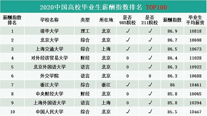 根據《2020中國高校畢業生薪酬指數排行》顯示,全國大學生畢業每月薪酬最高的是清華大學,平均薪酬為10818元;其次是北京大學,平均薪酬為10698元,第三位是上海交通大學,平均薪酬為10673元。