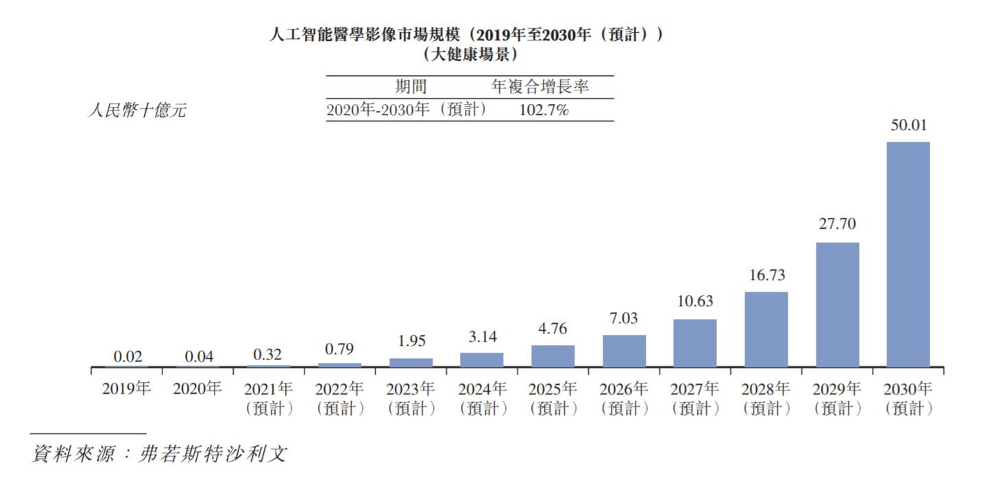 與此同時,據弗若斯特沙利文資料顯示,中國人工智能醫學影像市場規模則將從2020年的3億元達到2030年的923億元,年複合增長率高達76.7%。