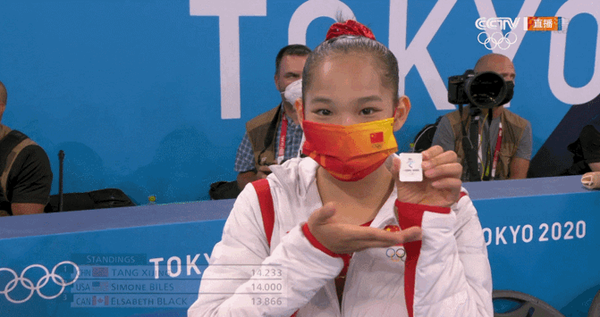 在體操平衡木決賽中,中國姑娘唐茜靖忽然拿出了一塊“麻將牌”懟着鏡頭展示。