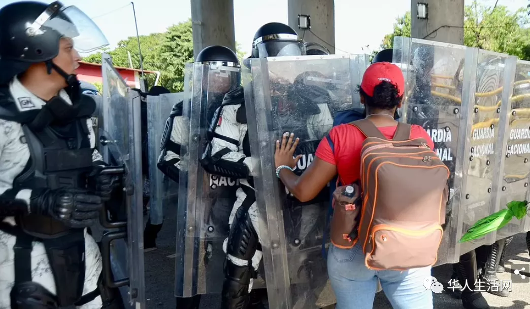 目前來看,墨西哥警察和邊境巡邏人員無法控制人羣。人們揹着揹包,肩上扛着孩子,擠過一羣穿着防暴裝備的警察。