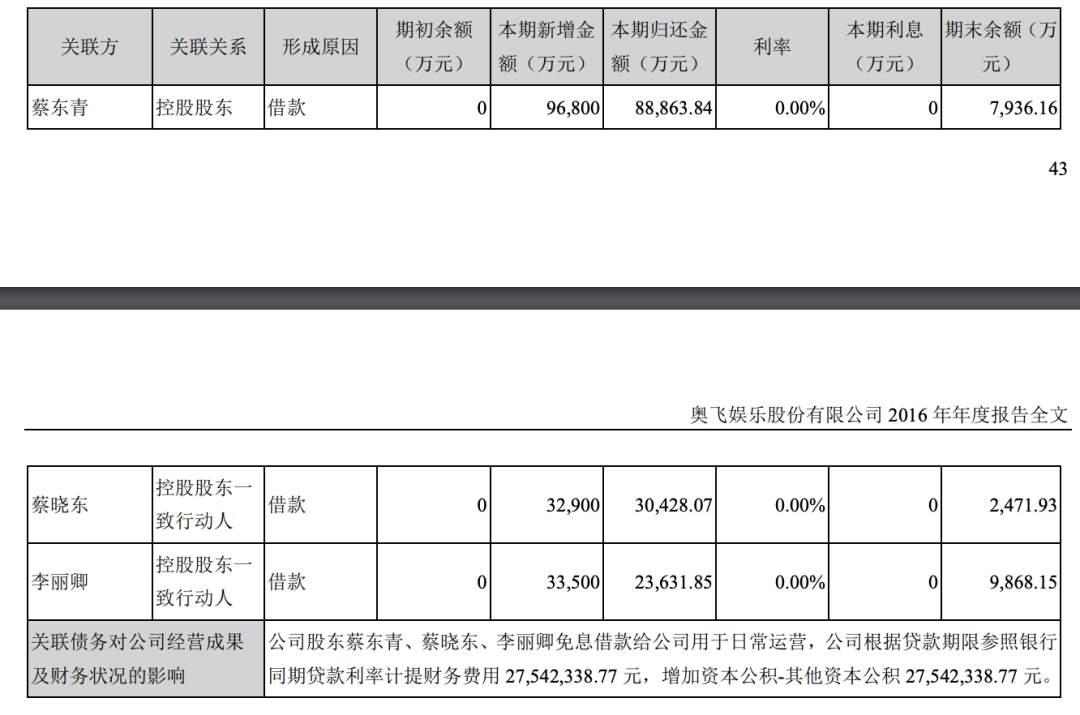對於套現的用途,奧飛娛樂曾表示,2016年,蔡東青、李麗卿、蔡曉東將減持所得的扣除相關税費後的16.32億元無償借給公司。